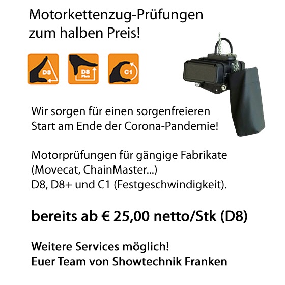 Die hier gezeigten Bilder verstehen sich als Musterdarstellungen für die aufgeführten Artikel und Pakete, um einen Eindruck des Leistungsumfanges zusätzlich zur Textbeschreibung zu vermitteln. Die Artikel auf den Bildern sind keine zugesicherte Eigenschaft des Angebotes. Wir behalten und vor, z.B. aufgrund der aktuellen Verfügbarkeitslage der Artikel, gleichwertige oder bessere Geräte auszugeben bzw. anzubieten. Alle Bildrechte: Showtechnik Franken.